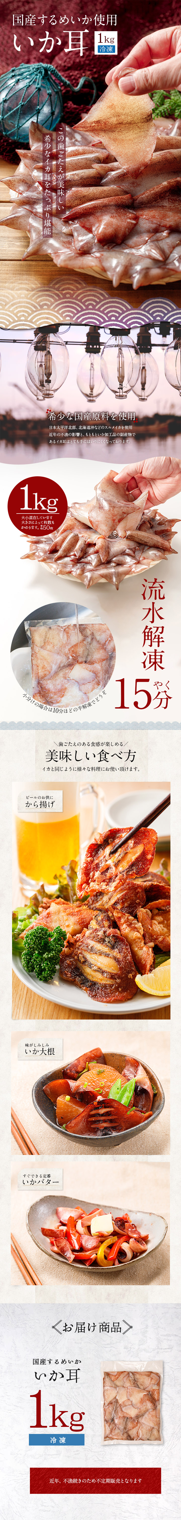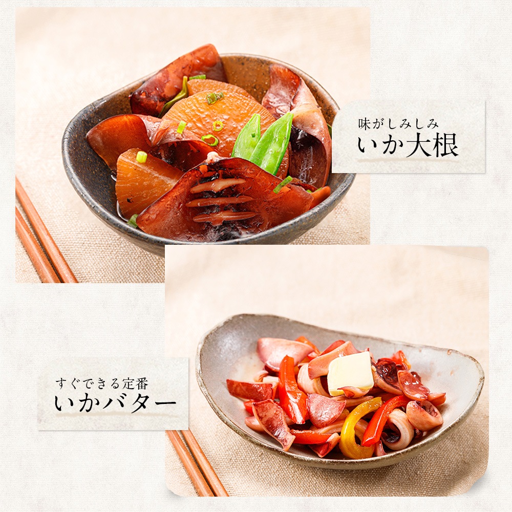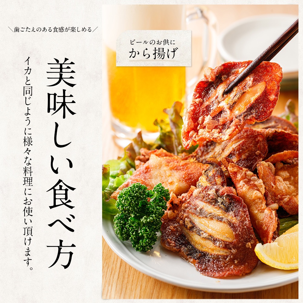 | 調理方法 | から揚げ、いか大根、イカバター焼き、天ぷら、照り焼きなど加熱してお召し上がりください。 |