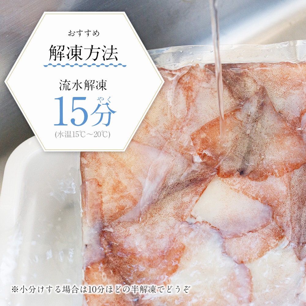 | 解凍方法 | 流水で約30分、小分けする場合は5分ほどの半解凍でどうぞ |