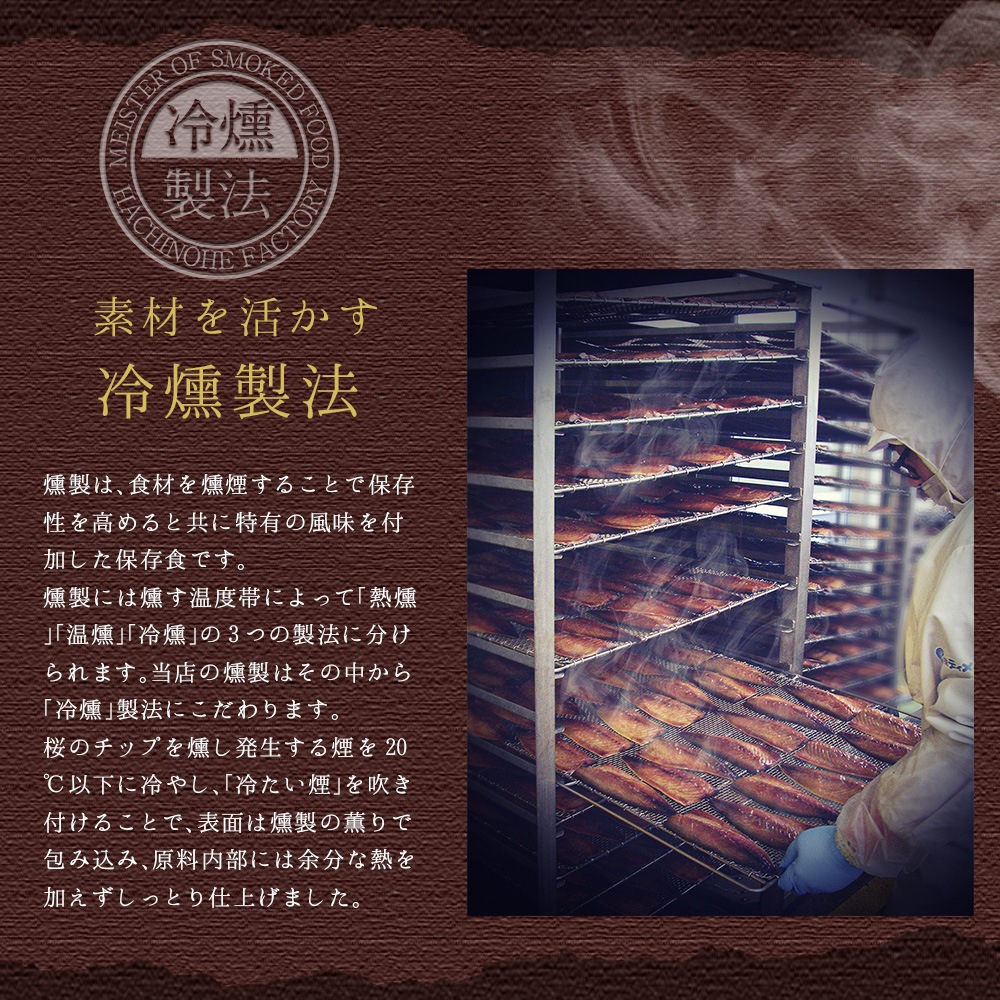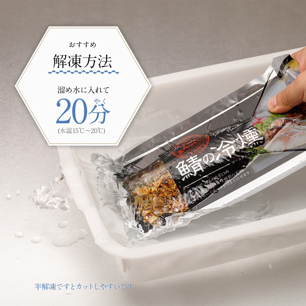 | 原材料 | を含む)【鯖の冷燻】さば(国産)、砂糖、しょうゆ(小麦・大豆を含む)、食塩、みりん、還元水飴/調味料(アミノ酸等) 【鯖の冷燻ソルト&ペッパー】さば(国産)、みりん、食塩、砂糖、黒こしょう |